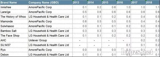 韓國品牌市場(chǎng)占有率情況,愛茉莉太平洋旗下悅詩風(fēng)吟和蘭芝分別占1.1%、0.6%,后0.5%,其次依次是夢(mèng)妝、竹鹽、菲詩小鋪、AHC、SU:M37、Ryo、Debon。