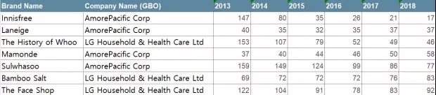 前10大品牌中,韓國品牌除了愛茉莉太平洋集團(tuán)和LG生活健康兩家企業(yè)之后,唯一上榜的是聯(lián)合利華。除了兩個(gè)老大哥以外,沒有一家企業(yè)提高知名度和占有率。百大品牌中,韓國有7個(gè)品牌上榜。