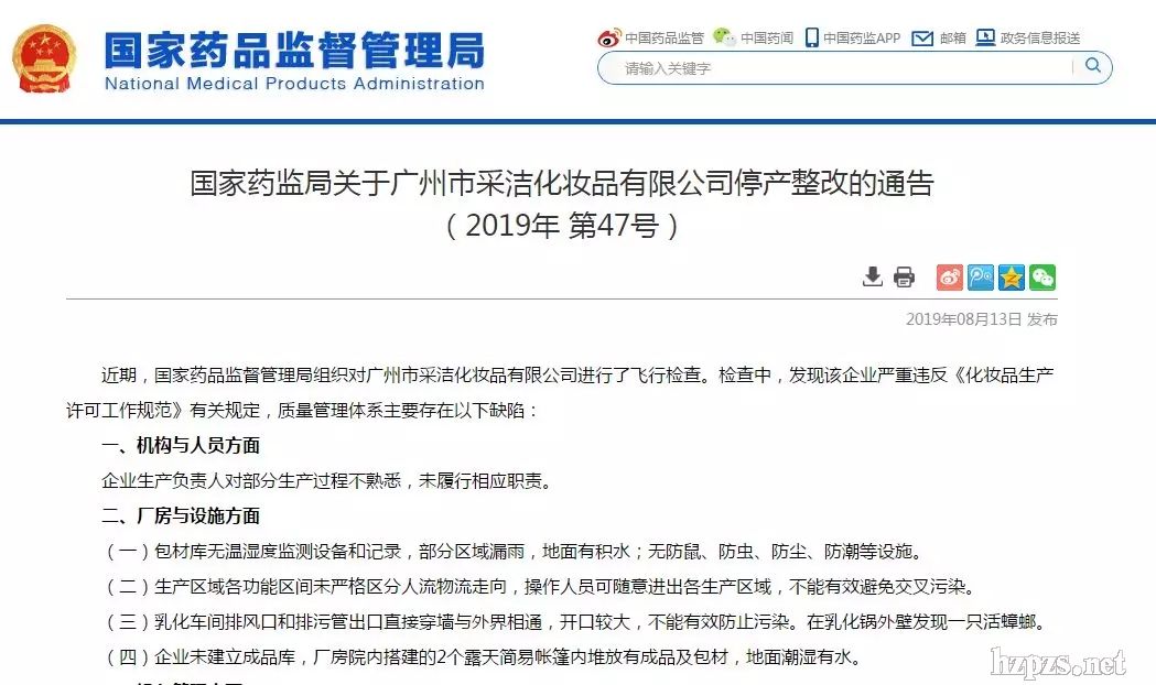 國(guó)家藥監(jiān)局公告:廣州市采潔化妝品停產(chǎn)整改2019-8-15 9:38:30 閱讀數(shù):