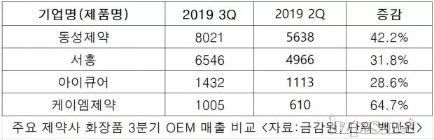 今年第三季度化妝品OEM(商品)銷售額為65億韓元,比第二季度(56億韓元)增長(zhǎng)了31.8%。