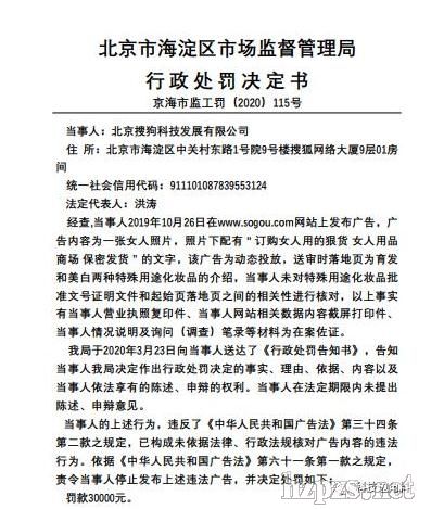 因未對廣告經(jīng)營者、廣告發(fā)布者未對廣告內(nèi)容核對,北京搜狗科技發(fā)展有限公司日前被北京市海淀區(qū)市場監(jiān)督管理局罰款30000元。天眼查披露的數(shù)據(jù)顯示,2019年10月26日,搜狗在其網(wǎng)站上發(fā)布廣告,廣告內(nèi)容為一張女人照片,照片下配有“訂購女人用的狠貨,女人用品,商場保密發(fā)貨”的文字,該廣告為動態(tài)投放,送審時落地頁為育發(fā) 和美白兩種特殊用途化妝品的介紹,搜狗公司未對特殊用途化妝品批準(zhǔn)文號證明文件和起始頁落地頁之間的相關(guān)性進行核對。