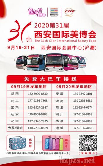 時(shí)間:09月19-21日 地點(diǎn):西安國(guó)際會(huì)展中心 9月19-21日,由德智行國(guó)際展覽集團(tuán)舉辦的2020第31屆西安國(guó)際美博會(huì)將在西安國(guó)際會(huì)展中心(浐灞)盛大召開(kāi)。  據(jù)悉本屆美博會(huì)預(yù)計(jì)600家品牌展商參展、2000個(gè)國(guó)際品牌盛裝亮相、1.5萬(wàn)平米展示面積,覆蓋醫(yī)療美容、美容美發(fā)、美甲紋繡、化妝品、美業(yè)培訓(xùn)機(jī)構(gòu)、美業(yè)微電商、大健康及養(yǎng)生保健、母嬰用品等美業(yè)全產(chǎn)業(yè)鏈。北京宏強(qiáng)集團(tuán)、廣州朗黛、慧康集團(tuán)、康威美爾、創(chuàng)宏儀器、深圳暨源肽諾、聚億美、奢藝祛疤、西安凱特百優(yōu)、欣奕除疤、廣州賽姿、山東夢(mèng)斯綺生物、南京偉思好翼、巨咖時(shí)代、岐山公頭療、絢麗美國(guó)際、曲祖顏方、伊斯頓生物、帥薇美發(fā)、成都嬌詩(shī)蘭等品牌企業(yè)均亮相本屆美博會(huì),展出各自的主打產(chǎn)品、技術(shù)和項(xiàng)目,交流最新的行業(yè)信息資訊。 目前已開(kāi)通咸陽(yáng)、漢中、渭南、商洛、漢中、寶雞和延安等12個(gè)地市免費(fèi)大巴車(chē)接送專業(yè)觀眾到場(chǎng)參觀,詳情咨詢:17791367868。  本屆博覽會(huì)將采取無(wú)接觸式辦理參觀證,線上登記為本屆美博會(huì)唯一參觀登記方式,觀眾需關(guān)注”“西安國(guó)際美博會(huì)”點(diǎn)擊右下方“觀眾入口”進(jìn)入“參觀報(bào)名”,填寫(xiě)相關(guān)信息完成參觀報(bào)名,展會(huì)現(xiàn)場(chǎng)需出示西安一碼通,綠碼且體溫正常方能入場(chǎng)。 大美有道,美行天下。您就是美的創(chuàng)造者,您就是美的傳播者,您也將是美的受益者,西安國(guó)際美博會(huì)期待您的加入,與您共享國(guó)際美業(yè)盛宴! 參展、參觀熱線:152 0299 6599劉經(jīng)理