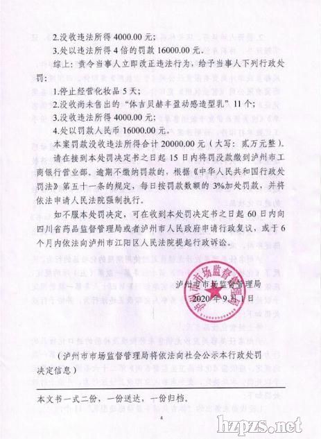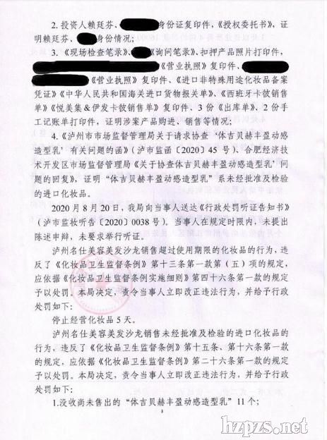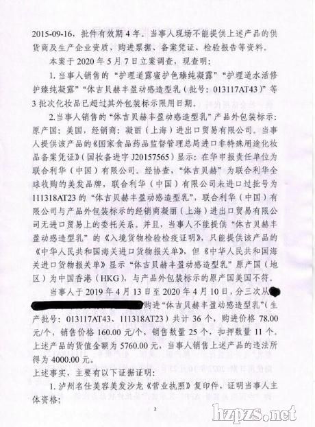 (截圖來源:瀘州市市場監(jiān)督管理局官網(wǎng))     (圖片來源:瀘州市市場監(jiān)督管理局官網(wǎng)) 9月7日,瀘州市市場監(jiān)督管理局發(fā)布2020年第22期抽檢信息公告。公告稱,今年4月23日,瀘州市市場監(jiān)督管理局執(zhí)法人員對瀘州名仕美容美發(fā)沙龍開展監(jiān)督檢查,在該店貨柜上查見: “護(hù)理道露蜜護(hù)色臻純凝露”外包裝標(biāo)示:凈含量100ml,原產(chǎn)日本,請于2019年11月前使用,國妝備進(jìn)字J20152767,生產(chǎn)者為資生堂),數(shù)量1盒; “護(hù)理道水活修護(hù)臻純凝露”外包裝標(biāo)示:凈含量100ml,原產(chǎn)日本,請于2019年11月前使用,國妝備進(jìn)字J20152751,生產(chǎn)者為資生堂,7-5-5),數(shù)量1盒; "體吉貝赫豐盈動感造型乳”外包裝標(biāo)示:原產(chǎn)美國,生產(chǎn)批號:013117AT43,限期使用日期:2020年01月30日,備案文號:國妝備進(jìn)字J20157565,經(jīng)銷商:凝麗(上海)進(jìn)出口貿(mào)易有限公司,數(shù)量1個; “體吉貝赫豐盈動感造型乳”外包裝標(biāo)示:原產(chǎn)美國,生產(chǎn)批號:111318AT23,限期使用日期:2022年10月25日,備案文號:國妝備進(jìn)字J20157565,經(jīng)銷商:凝麗(上海)進(jìn)出口貿(mào)易有限公司,數(shù)量10個。 經(jīng)過調(diào)查后發(fā)現(xiàn): 當(dāng)事人銷售的護(hù)理道露蜜護(hù)色臻純凝露、護(hù)理道水活修護(hù)臻純凝露、"體吉貝赫豐盈動感造型乳”等3批次化妝品已超過其外包裝標(biāo)示限用日期。 當(dāng)事人銷售的體吉貝赫豐盈動感造型乳產(chǎn)品,經(jīng)現(xiàn)場查詢顯示該產(chǎn)品批件狀態(tài)為注銷。 據(jù)悉,當(dāng)事人于2019年4月13日至2020年4月10日,分三次購進(jìn)“體吉貝赫豐 盈動感造型乳”共計36個,購進(jìn)價格78.00元/個,銷售價格160.00 元/個,銷售數(shù)量25個,扣押數(shù)量11個。 上述產(chǎn)品的貨值金額為5760.00元,當(dāng)事人銷售上述產(chǎn)品的違法所得為4000.00元。 本案于2020年5月7日立案調(diào)查,現(xiàn)查明名仕美容美發(fā)沙龍銷售超過使用期限、銷售未經(jīng)批準(zhǔn)及檢驗(yàn)的進(jìn)口化妝品。 瀘州市市場監(jiān)督管理局責(zé)令當(dāng)事人立即改正違法行為,給予當(dāng)事人下列行政處罰:停止經(jīng)營化妝品5天;沒收尚未售出的“體吉貝赫豐盈動感造型乳”11個;沒收違法所得4000.00元;處以罰款人民幣16000.00元。來源:瀘州市市場監(jiān)督管理局