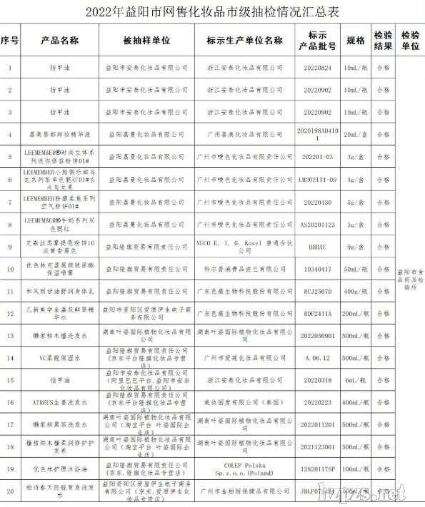 近日,湖南省益陽(yáng)市市場(chǎng)監(jiān)督管理局網(wǎng)站發(fā)布2022年網(wǎng)售化妝品抽檢情況公告。