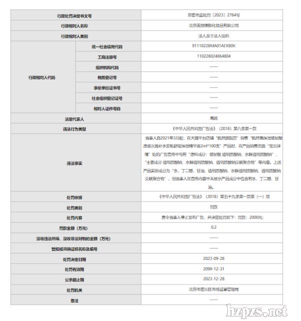 根據(jù)處罰信息,自2021年3月起,北京美麗臻顏化妝品有限公司在天貓平臺店鋪“甄然旗艦店”銷售“甄然高保濕玻尿酸原液次拋補(bǔ)水安瓶舒緩保濕精華液2ml*100支”產(chǎn)品時,在產(chǎn)品銷售頁面“寶貝詳情”處的廣告宣傳中寫有“原料成分:玻尿酸 透明質(zhì)酸鈉、水解透明質(zhì)酸鈉”、“主要成分 透明質(zhì)酸鈉、水解透明質(zhì)酸鈉、透明質(zhì)酸鈉交聯(lián)聚合物”等內(nèi)容。