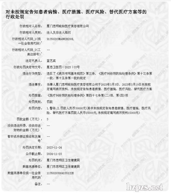 廈門思明唆和醫(yī)療美容被罰3萬元 未按規(guī)定告知患者病情等