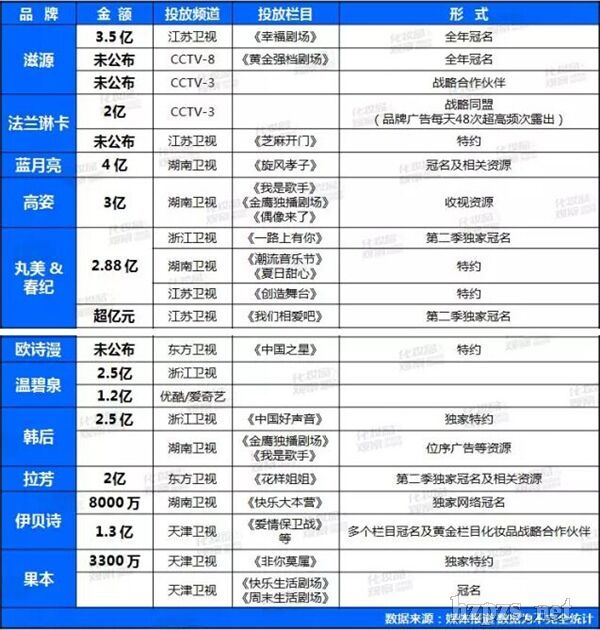 2014年底,我們看到韓束5億元冠名江蘇衛(wèi)視《非誠(chéng)勿擾》,環(huán)亞4億元砸到湖南衛(wèi)視,溫碧泉3億元結(jié)盟一線衛(wèi)視,還有百雀羚3億元、卡姿蘭2.5億元、韓后1億元……彼時(shí),在韓束創(chuàng)始人呂義雄看來(lái),低于1.5億元,連聲音都沒(méi)有。 而隨著2015年年底各大衛(wèi)視2016年廣告資源招商、招標(biāo)會(huì)的舉辦,這一門檻被進(jìn)一步拉高。顯然,日化行業(yè)新一輪的廣告大戰(zhàn)已然打響,相比2015年硝煙更盛。 55億+廣告都砸哪兒了? 近兩個(gè)月,大家估計(jì)被各品牌高價(jià)拿下各類廣告的新聞“砸”得有些暈,品觀君再帶著大家集中回顧一下。 2015年11月,上美公司15億元重金拿下湖南衛(wèi)視2016年《金鷹獨(dú)播劇場(chǎng)》《天天向上》獨(dú)家冠名及多個(gè)稀缺廣告資源,宣告日化品牌競(jìng)爭(zhēng)已進(jìn)入核武時(shí)代。不過(guò)對(duì)上美來(lái)說(shuō),15億并不是全部。 呂義雄曾透露,2016年將對(duì)旗下品牌一葉子和紅色小象分別投入5億廣告資源,而旗下品牌韓束、索薇婭也有各自的廣告計(jì)劃。具體都是哪些?品觀君根據(jù)上美公司已公布的廣告投放計(jì)劃做了一張表。  上美公司并不是唯一一個(gè)2016年廣告投入超過(guò)10億元的日化集團(tuán)。在2015年12月24日舉行的環(huán)亞集團(tuán)旗下滋源和法蘭琳卡雙品牌年會(huì)上,環(huán)亞集團(tuán)透露,為了實(shí)現(xiàn)雙品牌零售破100億的目標(biāo),環(huán)亞2016年將會(huì)為滋源投入8.9億元廣告?zhèn)鞑ベM(fèi)用,為法蘭琳卡投入5.5億元廣告?zhèn)鞑ベM(fèi)用。僅這兩個(gè)品牌就將投入總共近15億元的廣告預(yù)算,更不提再加上環(huán)亞集團(tuán)旗下以“做中國(guó)護(hù)膚品行業(yè)第一名”為發(fā)展目標(biāo)的美膚寶了。 為了讓大家更集中、更直觀地看清這些土豪究竟多有錢,品觀君還做了一張表: 2016年部分本土日化品牌 大型電視/網(wǎng)絡(luò)視頻項(xiàng)目投放統(tǒng)計(jì)  僅從上面兩張表中的已公布金額來(lái)看,本土日化品牌2016年電視/網(wǎng)絡(luò)視頻廣告投放總金額已超過(guò)40億元。而那些未被公布的廣告金額我們多少也能推測(cè)一個(gè)大概,例如韓束2015年5億元冠名江蘇衛(wèi)視《非誠(chéng)勿擾》,2016年《非誠(chéng)勿擾》的冠名費(fèi)想來(lái)也不會(huì)太低。 除此之外,一些未公布具體廣告投放金額的化妝品品牌也在陸續(xù)透露2016的廣告計(jì)劃。 自然堂在2015年底的代理商大會(huì)提出2016年將在2015年的廣告投入基礎(chǔ)上再增加5.3億元多投入,包括牽手綜藝NO.1平臺(tái)浙江衛(wèi)視,獨(dú)家冠名《蜜蜂少女隊(duì)》節(jié)目,并與湖南衛(wèi)視及其周播劇場(chǎng)《鉆石獨(dú)播劇場(chǎng)》展開(kāi)合作,另外更聯(lián)手前四強(qiáng)勢(shì)衛(wèi)視,綁定現(xiàn)象級(jí)大劇。 而在活泉2016年的戰(zhàn)略發(fā)布會(huì)上,馬曉寧表示,活泉的廣告投入將不低于銷售的30%,其中的50%將全面投向活動(dòng)的落地。2016年活泉的合作媒體包括浙江衛(wèi)視、湖南衛(wèi)視、CCTV6、CCTV8、旅游衛(wèi)視等。凱芙蘭則提出要在2016年春節(jié)投放13大衛(wèi)視的廣告。 品觀君因此大膽揣測(cè),2016年本土日化品牌電視/網(wǎng)絡(luò)視頻廣告投放總金額應(yīng)已超過(guò)55億元。而據(jù)去年同期的不完全統(tǒng)計(jì)數(shù)據(jù)顯示,2015年本土品牌在電視媒體的投放總額超過(guò)23億元。 2016年電視廣告大戰(zhàn)怎么打? 從23億元到55億元,日化品牌們買到了更多的廣告嗎?優(yōu)質(zhì)廣告資源價(jià)格的大幅上漲或許是更重要的原因。據(jù)業(yè)界知情人士透露,2016年度湖南衛(wèi)視大部分優(yōu)質(zhì)廣告資源漲幅已近100%,部分此前價(jià)值7萬(wàn)元的廣告在2016年將漲至20萬(wàn)元。 其他一線衛(wèi)視的廣告資源也有不同幅度的上漲,比如,百雀羚1.8億元獨(dú)家特約2015年《中國(guó)好聲音》,而韓后2.5億元方才競(jìng)得2016年《中國(guó)好聲音》的獨(dú)家特約權(quán)。 除了價(jià)格上漲,2016年電視廣告投放還有什么新的特點(diǎn)?代理了湖南衛(wèi)視、浙江衛(wèi)視、江蘇衛(wèi)視等多家衛(wèi)視廣告的媒介策略顧問(wèn)公司順風(fēng)傳媒董事長(zhǎng)韓順興認(rèn)為,央視和地面頻道的廣告收入在新的一年會(huì)進(jìn)一步減少,衛(wèi)視的總體廣告份額雖然沒(méi)有太大變化,但是一線衛(wèi)視強(qiáng)者愈強(qiáng),二三線衛(wèi)視的廣告資源則會(huì)出現(xiàn)一定的空置。 韓順興表示,“原來(lái)湖南衛(wèi)視、浙江衛(wèi)視、江蘇衛(wèi)視、東方衛(wèi)視、天津衛(wèi)視、北京衛(wèi)視各有各的目標(biāo)客戶,現(xiàn)在這個(gè)集中度在進(jìn)一步加劇,二三線衛(wèi)視的日子也比較難過(guò)。” 從上表中可以看到,日化品牌們的大額廣告資金還是涌向了湖南衛(wèi)視、浙江衛(wèi)視、江蘇衛(wèi)視三大一線衛(wèi)視的現(xiàn)象級(jí)節(jié)目。 網(wǎng)絡(luò)視頻廣告投放時(shí)機(jī)正在成熟 上周末,品觀君想上PPTV看個(gè)視頻,卻被迫看了60秒的日化廣告,有巴黎歐萊雅男士、舒蕾、兩面針……日化品牌是什么時(shí)候盯上網(wǎng)絡(luò)視頻廣告的? 韓順興表示,網(wǎng)絡(luò)視頻廣告數(shù)量的上升是一個(gè)大趨勢(shì),2016年各家本土化妝