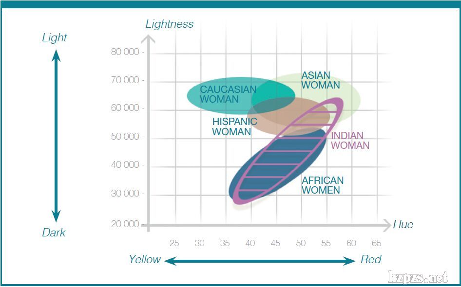 圖表中,橫軸代表女性皮膚的色調(diào)(從左至右依次代表由黃向紅漸變),縱軸代表女性皮膚的亮度(從上到下依次代表由淺向深漸變)