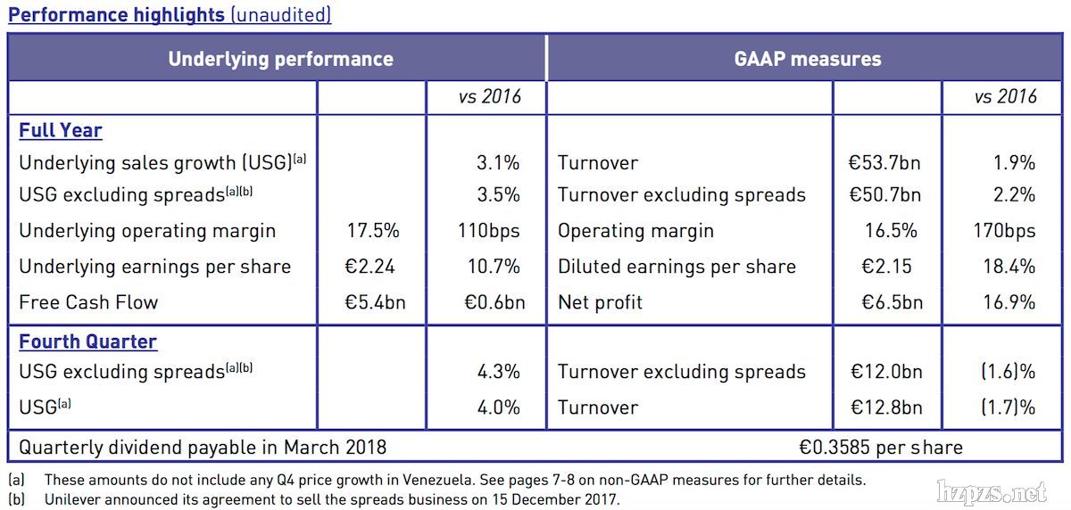 截止2017年12月31日,聯(lián)合利華2017財年第四季度和全年的核心財務(wù)數(shù)據(jù)如下: