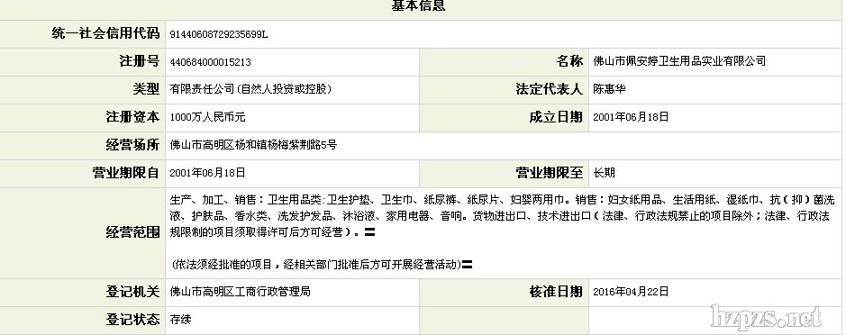 佛山市佩安婷衛(wèi)生用品實業(yè)有限公司 佩安婷 地 址: 佛山市高明區(qū)楊和紫荊路5號