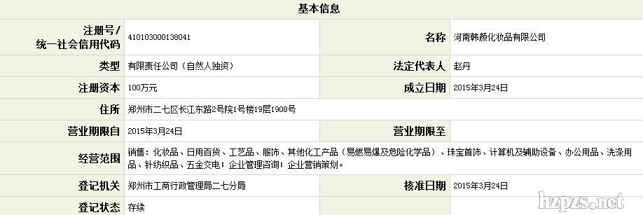 河南韓顏化妝品有限公司 趙丹 地 址: 鄭州市 鄭密路中原城
