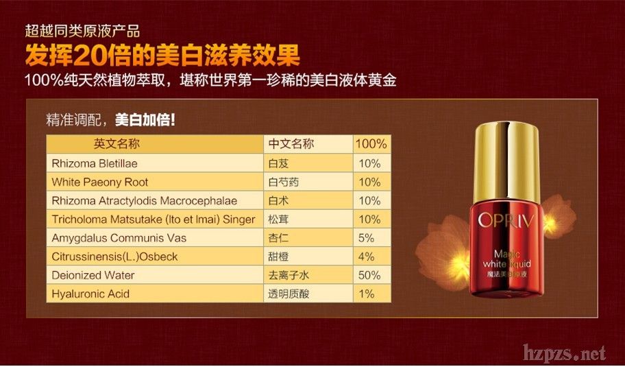 產(chǎn)品用途美容師推薦這款魔法美白原液,它大吸引眾人的眼球是一抹現(xiàn)場改善美白效果,還有配方,高濃縮植物提取液,天然達到美白效果。涂抹后立刻美白,定妝效果好,非常滋潤,防水性好,無違禁成分,有美白特證。目前也是市場,能現(xiàn)場讓消費者立刻見美白效果的產(chǎn)品,現(xiàn)場銷售說服力非常強。