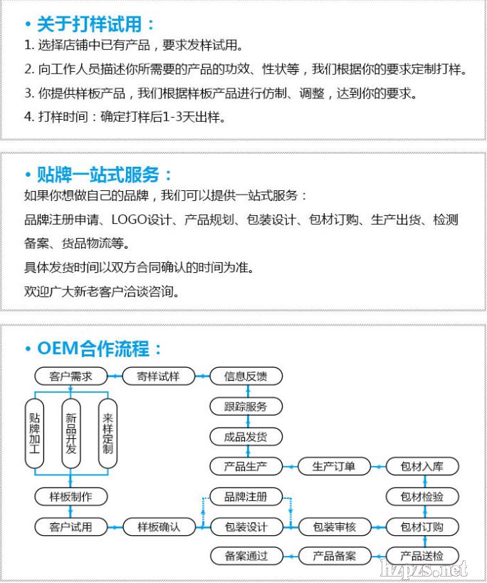 | OEM/加工方案: 1、【貼牌】可用您的品牌我來加工。 2、【仿樣】可按您的樣品我來加工。 3、【配方加工】可按您的配方我來加工。 4、【灌裝】可用您的外包裝、按您的要求量,我來灌裝加工。 5、【一站式】商標注冊、LOGO設(shè)計、包裝設(shè)計、包裝采購、產(chǎn)品定制、生產(chǎn)加工、代發(fā)貨。 6、【其他】可為您的要求找包材,印刷包裝盒、說明書和標簽做好設(shè)計和定購 |