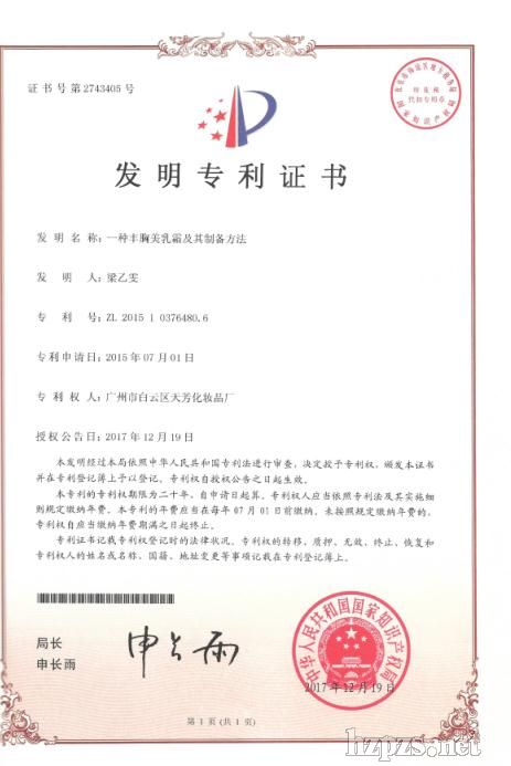 | 專利證號(hào):ZL201510376480.6,[發(fā)明],一種豐.胸美.乳霜及其制備方法 摘要:本發(fā)明的一種霜;由以下重量份數(shù)的原料制成:氫化聚癸烯20~22份、亞麻籽油14~16份、蜂蠟10~12份、茯苓6~8份、玉米6~8份、山藥6~8份、葵花籽15~17份、薏仁8~10份、天葵子10~12份、延胡索20~22份、羅布麻18~20份、蛇麻草12~14份、杜仲14~16份。本發(fā)明的霜涂覆在使用者的乳房上后,使用者雙手并攏對(duì)壓,由胸骨向胸部周圍下方向延伸至腋下,再往上提拉至鎖骨處,如此重復(fù)10次左右;使用者雙手由乳根穴處把整個(gè)乳房往上提伸,如此重復(fù)18次左右。本發(fā)明霜,可以通絡(luò)、調(diào)和氣血,調(diào)節(jié)人體新陳代謝和氣血循環(huán);從而促進(jìn)乳腺的發(fā)育,使乳房增大堅(jiān)挺。 |